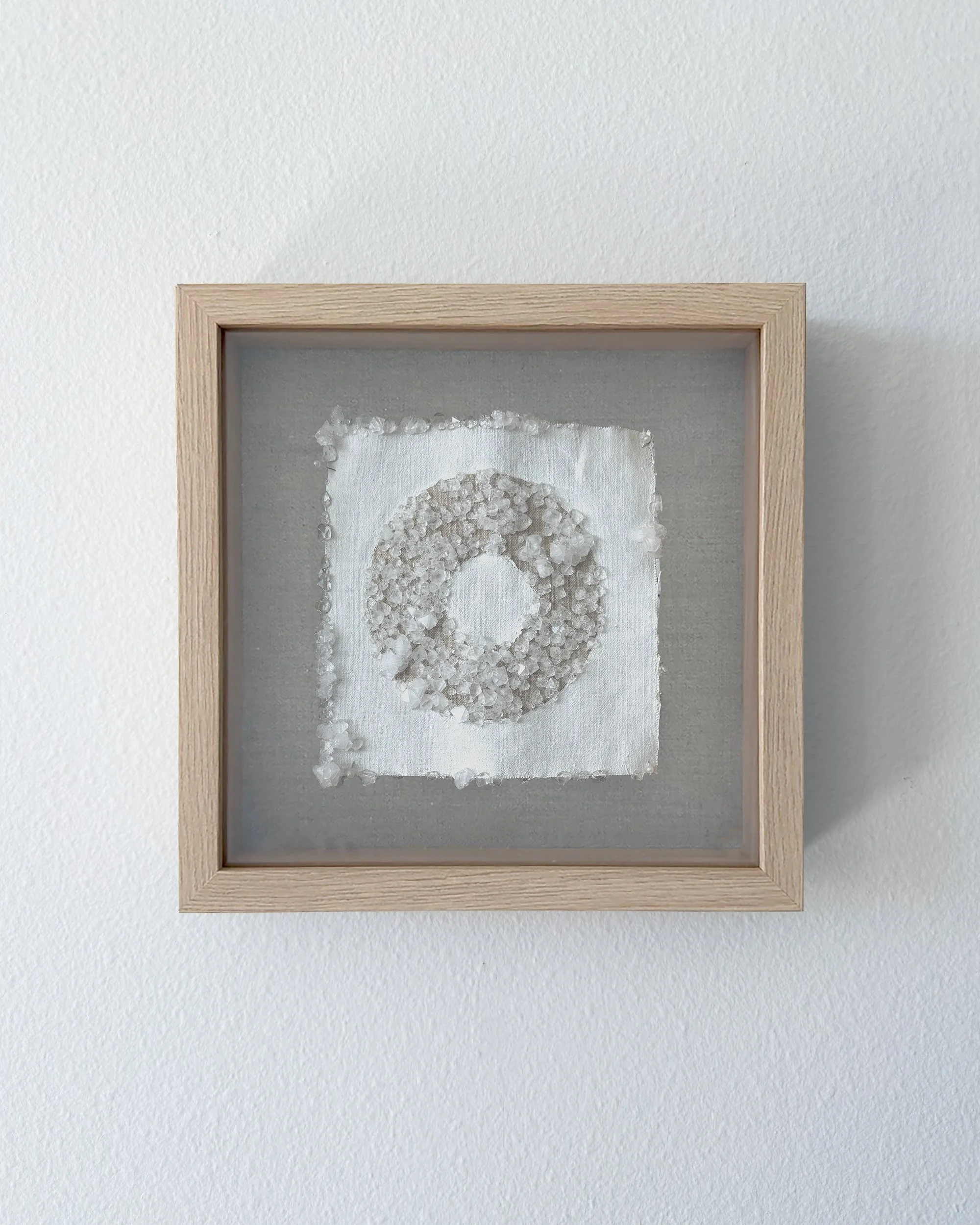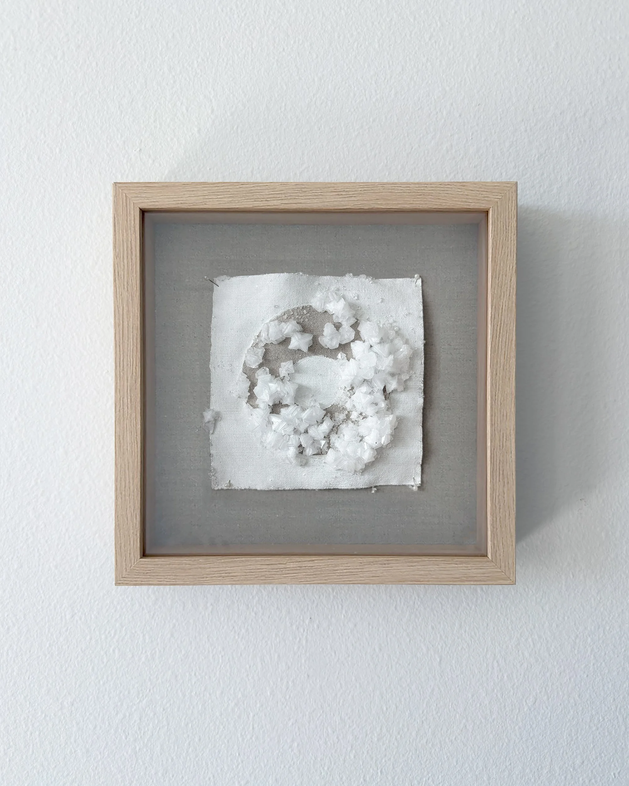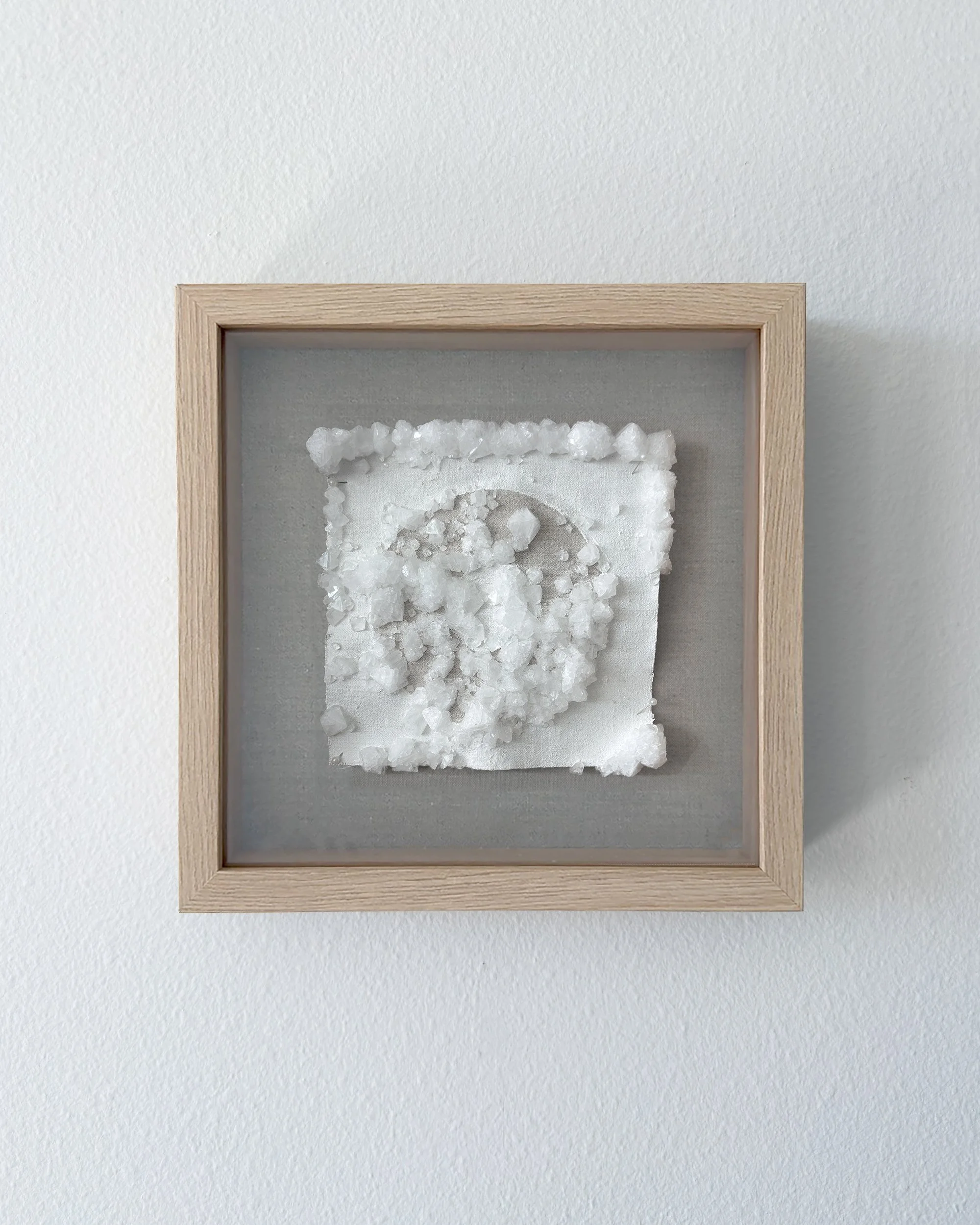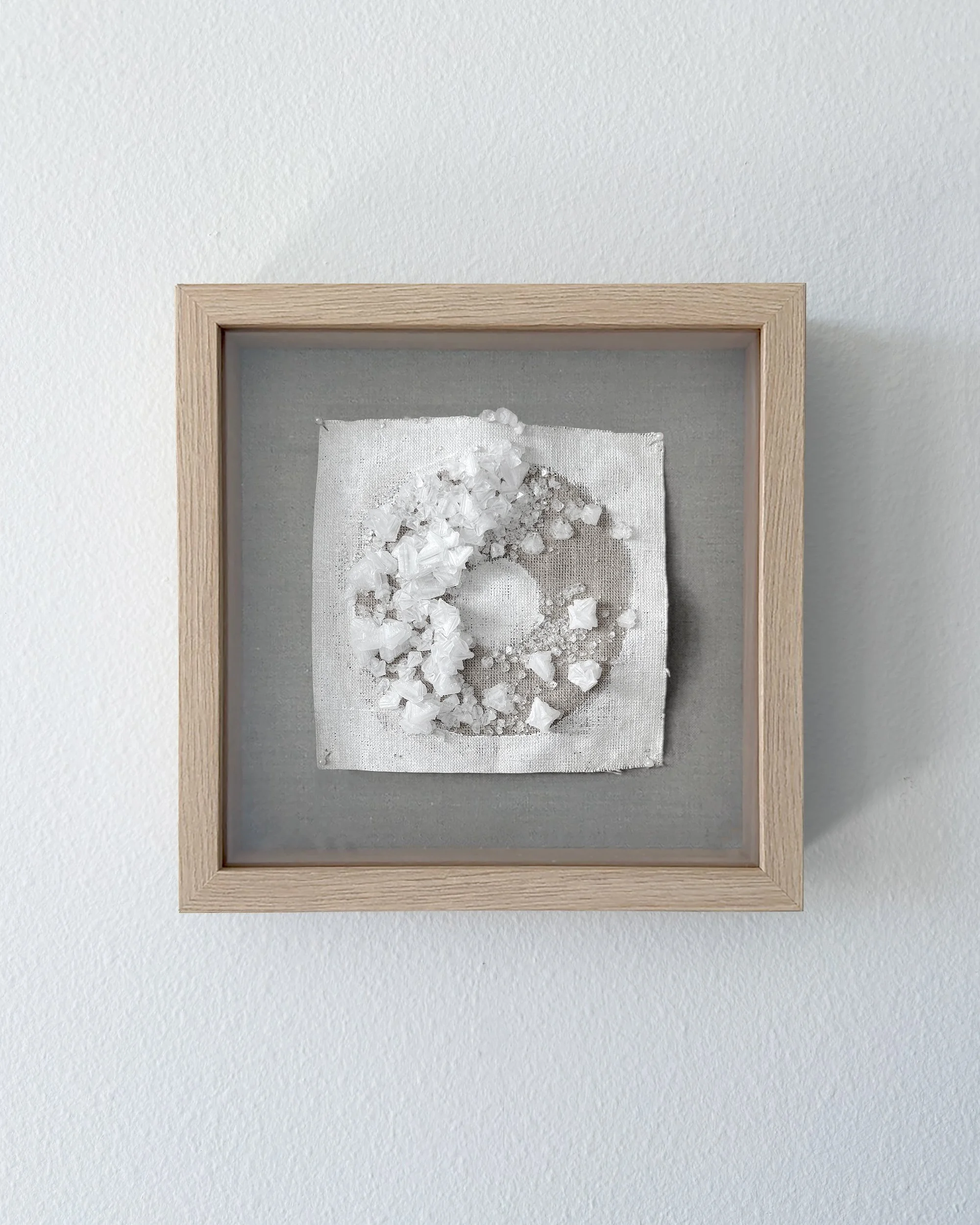 A series of small format wall sculptures featuring crystals grown on linen with a gesso resist. The backdrop for each is nearly identical, as are the conditions the pieces are exposed that promote crystal formation. An exercise in artistic surrender, nature directs the final outcome of each, influenced only by minor interventions during the growth process.